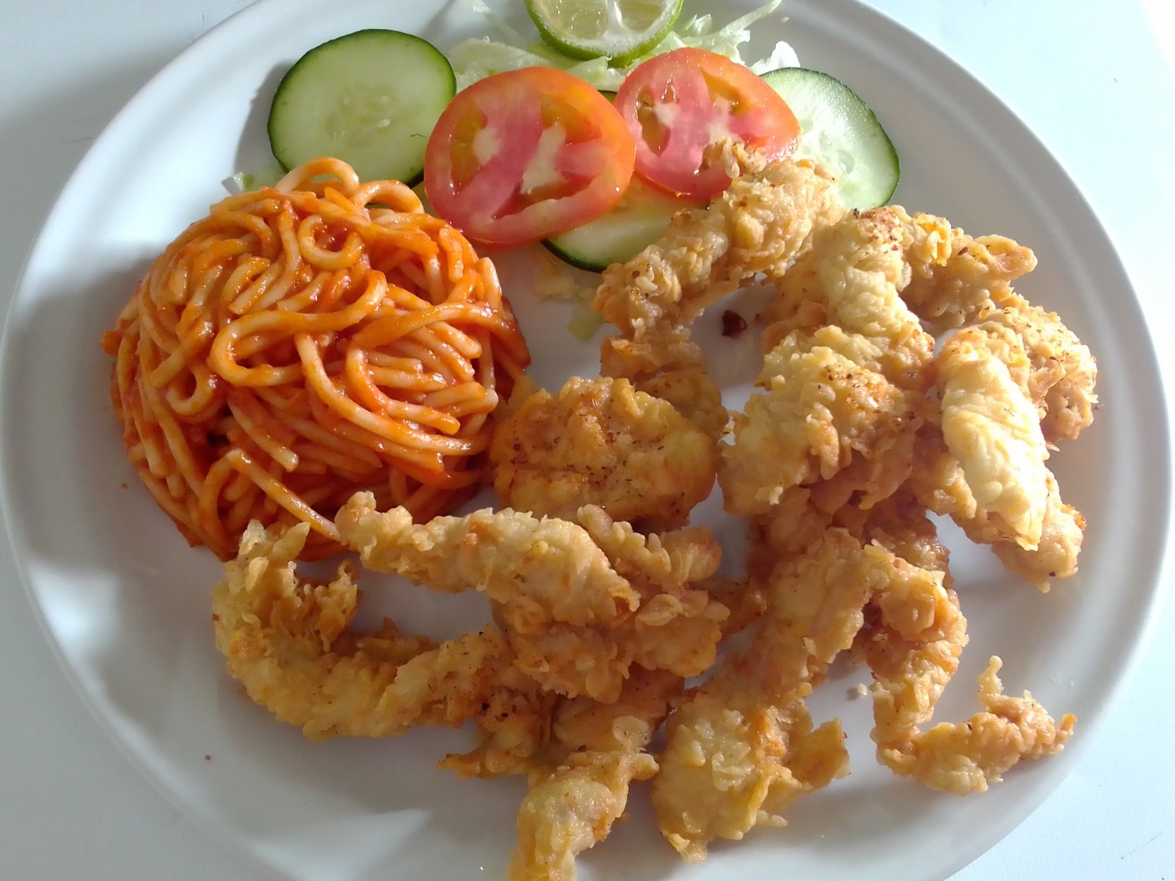 Tiras de pollo fritas y crujientes con un toque de chile Tajín, acompañadas con una porción de espagueti rojo y frijoles refritos