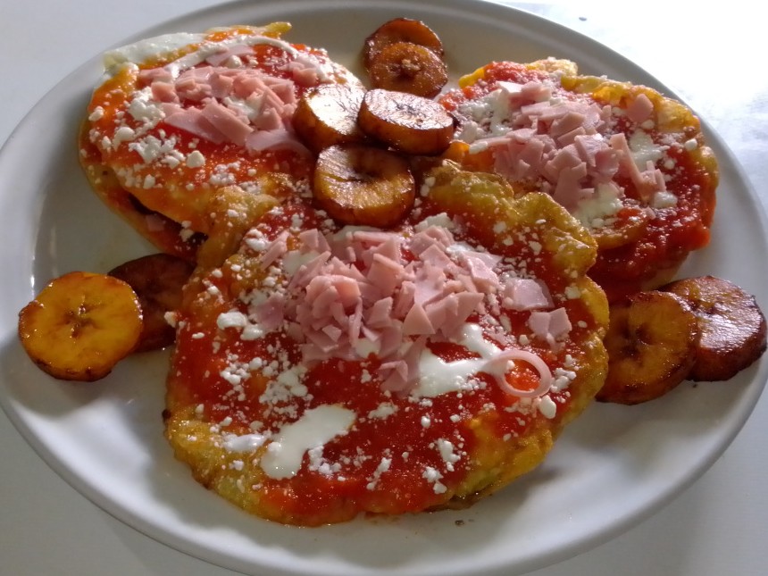 Tres tostadas, cubiertas de frijol refrito, un huevo estrellado por cada una y bañadas de una salsa de tomate frito, jamón picado, queso blanco acompañado con unas rebanadas de plátano frito