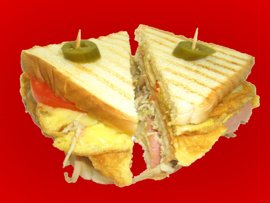Elaborada con tres rebanadas de pan de caja bien tostados, rellenas de jugosa pierna de cerdo, jamón, queso manchego, un huevo omelette, romanita y tomate frescos