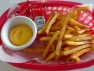 Papas a la francesa, acompañadas de cátsup y queso fundido.